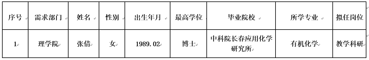 经学院(部)和学校组织的两级试讲、面试,以及综合考核,我校拟录用以下专业技术岗位人员来校工作,现将人员基本情况公示如下: 公示时间为2019年12月26日至2020年1月2日。 对公示对象有任何反应,请于公示期间,与纪委或人事处联系。反映情况和问题须实事求是,客观公正。提倡署名或提供联系方式,以便调查核实,及时反馈。 人事处办公地址:江苏省南京市龙蟠路159号南京林业大学老图书馆231室 人事处电子信箱:rs@njfu.edu.cn 纪委电话:85427248 人事处电话:85420686