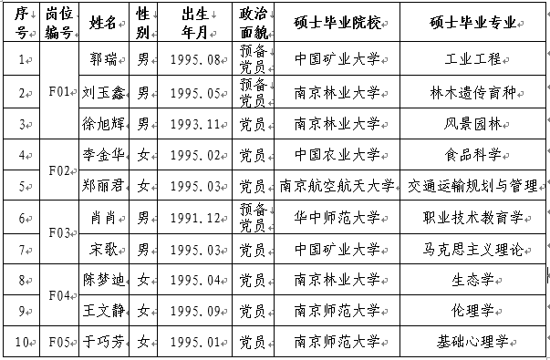 根据《南京林业大学2019年辅导员招聘公告》,经报名、资格审查、笔试、面试、心理测试、体检、政审等环节考察,拟录取以下10人为我校专职辅导员,现就基本情况公示如下: