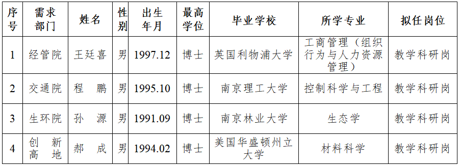 经学院(部)和学校组织的两级试讲、面试,以及综合考核,我校拟录用以下专业技术岗位人员来校工作,现将人员基本情况公示如下: